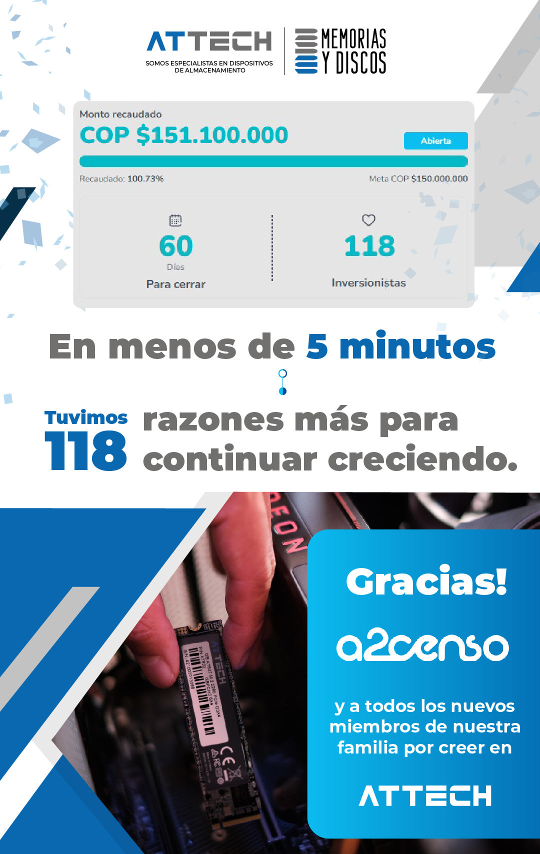 En 2023 para continuar con nuestro plan de expansión, gestionamos una inversión de 150 millones de pesos a través de la plataforma de financiamiento colaborativo a2censo perteneciente a la bolsa de valores de Colombia. Esta iniciativa fue un